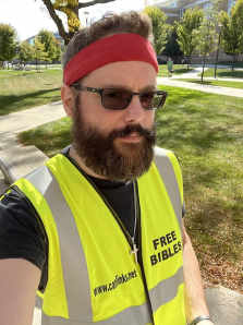 USA Brother Jason Kominek is again active wearing the yellow Free Bibles vests and distributing literature in Ohio- he says he has been "At BGSU, using a model I made of the bronze serpent from Numbers 21 as a visual aid to make points about the gospel."And as Moses lifted up the serpent in the wilderness, even so must the Son of Man be lifted up, that whoever believes in Him should not perish but have eternal life."John 3:14-15""