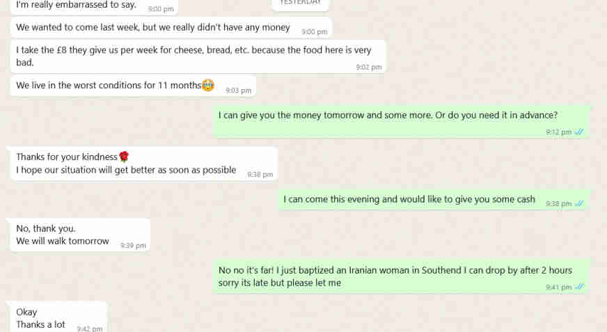 Our attenders are from a wide range of social situation. We have an Iranian asylum seeker brother who lives in an emergency hotel with his 10 year old son, who gets 8 pounds / week to live on, as his welfare payments are largely taken by the hotel in lieu of meals- which are curry and rice three times / day. So he is living on about 1 pound / day, with a child to support. They were prepared to walk about 2 hours to our meeting due to no fare money, although as you can see from the below, we did persuade him to let us visit him and give him some cash:
