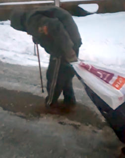 You can see a brief video taken last Winter of an old lady, bent over and relying upon a cane, seeking to navigate the ice and snow-