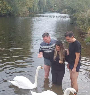 https://youtu.be/DRAr8CTVP1k And we're pleased to tell you of the baptisms of NAVID and his wife KIMIA in the river Avon. They and their young child were brought to the UK by traffickers who kept them for 2 months in a location they are unaware of, beating them and threatening the child, in order to get more money out of them. They are now finally safely in the UK seeking asylum. We need to pray for all those with PTSD, diagnosed or not. Despite all that trauma, their faith in the Lord Jesus and His Father is totally wonderful, and we had a long and wonderful time of fellowship together. The baptisms were slightly unusual in that they were performed under sustained attack from swans, who bit Navid's toe as he was being baptized.