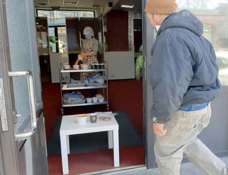 Riga. We are now about the only soup kitchen operating. With night shelters closing, people unable to get odd jobs, jobs being retrenched... the numbers attending are increasing. It's the same scene as described before- soup prepared, sandwiches put in a plastic bag and coffee in cups. Then this is placed on a table in the entrance. Cindy keeps the supplies flowing, whilst Max and Duncan ensure the people [we had 65 on Tuesday] line up with 2 meters distance between them; and then, which is far more difficult, ensure they go and eat away from the entrance and 2 meters away from each other. You can see a brief clip of a sister doing this at