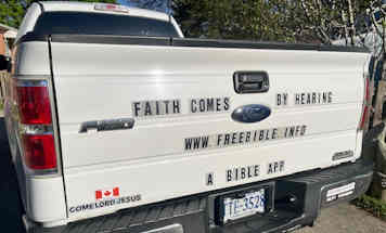 "I've come to realize my truck tailgate message is an in your face kind of thing. More effective than a small bumper sticker because everyone who sees the large words is very possibly touched by their conscience to reflect on their relationship with their creator! I was initially reluctant because my pride considers this as tacky yet as I considered advertising my business and phone number in bold letters to generate interest in what I have to offer, I thought why is that not considered tacky! So began my journey to touch every conscience that has the fortune or misfortune to be behind me on the freeway or walk by in a parking lot. Even just sitting in my driveway all of my neighbors are aware I have a special hope I want to share. Even to my surprise that a 10-year-old school girl stopped to thank me for my witness and I now have a relationship with her parents, and there is interest in her possibly attending our youth camp here in Virginia. On occasion, I will get a toot from a passing car with a thumbs up or at a light they will roll their window down and thank me for the witness. In parking lots on occasion, people have taken pictures to capture the website for freebible.info. So don't be afraid to share your hope and realize you can touch untold 1000s of souls everywhere you travel to the grocery store, work , running errands around your town and especially on trips where you can touch every heart in each vehicle whose eyes glance at your message to consider listening to Gods word!"