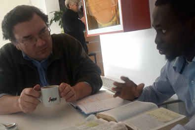 At that time we were feeding the migrants in the stretch of land between the camp and the beach, teaching them as we did and distributing NEV Bibles. We were asked for another Bible by one man, to give to his friend. We gave the Bible. And that NEV Bible with commentary got into the hands of Samuel, although he didn't meet us at that time. This is how providence works.