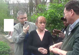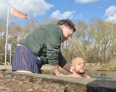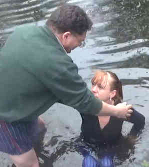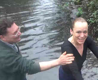 After Lunchtime Church on Tuesday we baptized CLAIRE, who has been attending on and off for a long time and really has turned her life around. She wanted to fellowship the Lord's sufferings by being baptized not in our bath tub but in a river... although it's still cold at this time of year. She took us to a place in Mitcham [next suburb from Croydon] we never knew existed. There's a bit of wooded wasteland where the small Rover Wandle flows and gushes down to a sluice. Along with sister Cis, brother Tony [Spiro's brother in law] and a friend of Claire's, we walked through the woods to the small bit of exposed river. The air was thick with the smell of cannabis being smoked by various people lurking in the woods- it was clearly a drug handover area. There's a bench by the riverside. There was a young man sitting on the bench smoking a spliff... when he overheard our conversation, he asked if we'd like him to move away. We encouraged him to stay and watch, and gave him a card advertising Church in a Pub and urged him to download the Bible Companion app; he said he would... You can see him in the far left of the photo, face obscured. We undressed, prayed, had a simple baptism service and immersed Claire in the dirty water, with broken bottles and other sharp objects on the river bed. And so in the heart of south London, in a drug handover spot in the woods by the River Wandle, Claire was reborn. What a strong and wonderful woman to have been so determined to come to the Lord Jesus. Well done Claire, and all praise to the Lord Jesus for His tireless work in yet another life. Claire's friend was not a Christian but says she wants to study the Bible as well and some day get baptized.