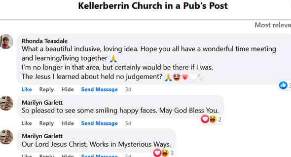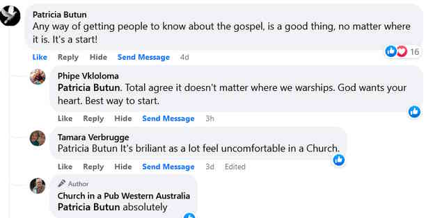 Church in a Pub Western Australia" Facebook page alone, there were over 650 positive "Like", around 40,000 people were reached, and a massive 91 people shared the page with their friends. And the 220 comments and discussions on the page were very positive. Clearly people in Australia really, really like the idea. You can read all the comments yourselves on the page but a few are below. So many believe in some way, but are for whatever reason put off church. And they are looking for exactly something like this.