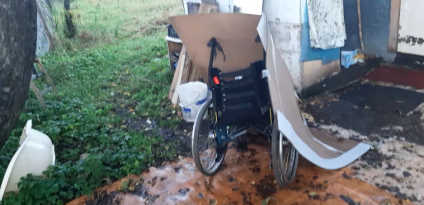 We visited the shack in the day time too; here's her wheelchair, with some cardboard over it to keep the worst of the rain off it: