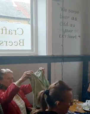 Sister Evia has now joined Horley ecclesia but continues active with us at Croydon Church in a Pub. She brought some lovely clothes donated by Horley ecclesia and we then distributed them at pub church, with eager reception as you can see in