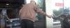 Invalids continue coming, shuffling down the street to our hall from the bus stop. Here's one who found it hard to even climb the two steps up to the door: