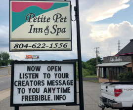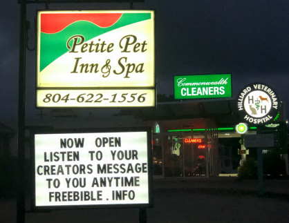 USA Always good to see someone unashamed to witness to the Truth in the course of their secular life, not keeping their light under a bucket. Brother Tim Anderson sent these pics of his advert for the website of the Bible app on his business signboard in Virginia USA- looks especially striking at night. Let's all make the witness.