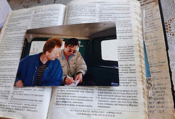 Vladimir had in his Bible a photo someone had taken of him and Duncan having a "chat" by writing in an exercise book, in the back of Duncan's van in which he lived in the early 1990s. It was very well preserved: