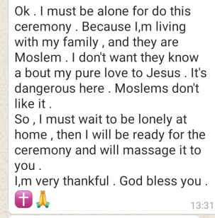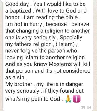 Afterwards they wrote: "May God bless you and take refuge in our Lord Jesus Christ. My family and I have a lot of peace after the baptism, a good feeling and a new life. I wanted to thank you. Please pray for us that one day we can go to church".