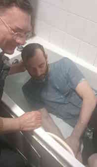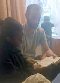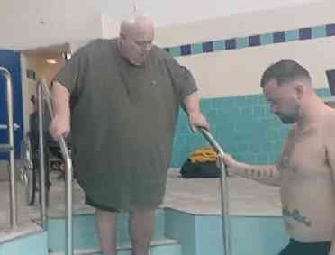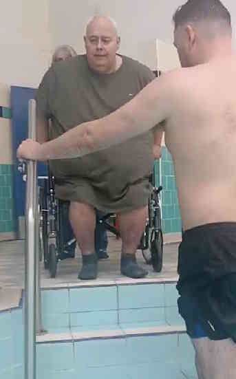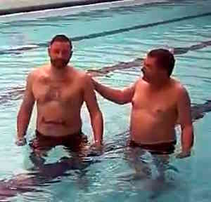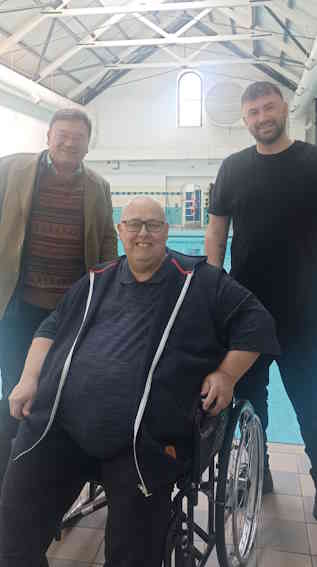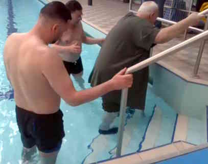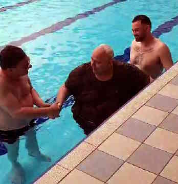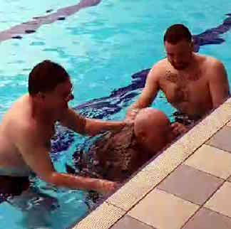 For some time, we'd had contact with SAMMY, an invalid who lives in a lovely Scottish village. He so wanted to be baptized into the Lord but being 180 kg. [28 stone] nobody much wanted to help him. He and his wife arranged for the private use of a pool, but it was over to me to come and do the baptism. I was concerned about how I was going to baptize such a heavy person- if he slipped and went under, I'm not so strong and muscular as to pull up 180 kg. out of the water. I really needed someone to help me. I was thinking of this for some weeks before the baptism. And then the phone rang, and it was a man from Glasgow called KIERAN, disillusioned with church and wanting to be baptized just into Jesus in spirit and truth. I asked if he could come to the pool and be baptized and then help me baptize Sammy. And that's just what happened. As is said, "You can't make this stuff up". The Lord provided just what I needed, just what He needed... a good strong brother to help baptize Sammy. So, as you can see from the photos Kieran was baptized and then the amazing, determined Sammy.