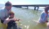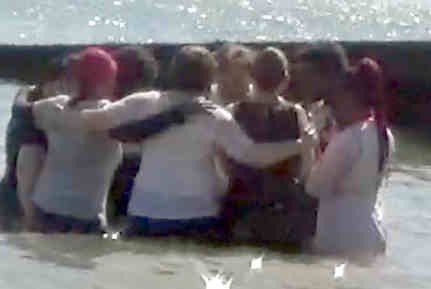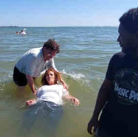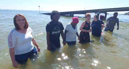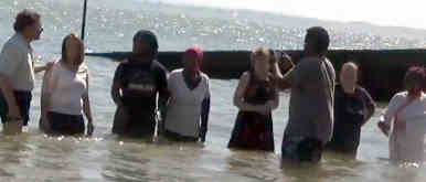 NEV Bible for a long time now. And so they all got the train to Southend, where we had ice cream and chips etc. as we watched the tide come in- just right for the baptisms. Baby was brought too, in the pram, and we found some shade beneath a pier and held a baptism service- and then lined up in the Thames Estuary, in lovely sunshine, for the baptisms. Such scenes are often reported from "the mission field" but here we had standard British Londoners lining up for baptism in the estuary of their famous river: