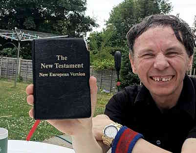 There are truly times when "you can't make these things up"; the hand of providence, the way of the Spirit, is so intricate and amazing, far beyond any human device. It was about 4 years ago that JASON was given a NEV New Testament on the streets of Croydon by one of our children wearing a yellow visibility vest. He says he remembers the moment clearly. Throughout those years he took that New Testament with him and read it- including the commentary and Bible Basics at the back of it. He took it to work, when he travelled, at home, everywhere. Our brother then started attending our Lunchtime Church meetings, and as ever brought his New Testament with him. He came up after one of the talks and asked to be shown something in his Bible. Duncan immediately recognized the Bible as one of "ours"- and with joy Jason made the connection, that we were the same people he had met those years ago. So, it was a wonderful afternoon when he brought his mum Carol to witness his baptism, with brother Ivan and brother Marcus also in attendance. Marcus was quite overcome with emotion hearing the story, as he's spent a lifetime handing out literature on the streets, including those of Croydon. Video of this wonderful story at