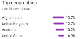 AFGHANISTAN Many Afghanis speak the same language as most Iranians do, and so our Farsi app and Farsi material has been widely accessed in Afghanistan. Again we marvel at how the Lord is using technology to enable us to more easily enter very difficult areas with the true Gospel. For the last month, Afghanistan has been the top country of the world for viewing our YouTube channel:
