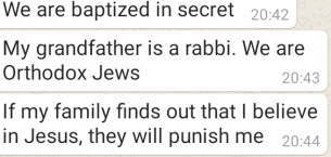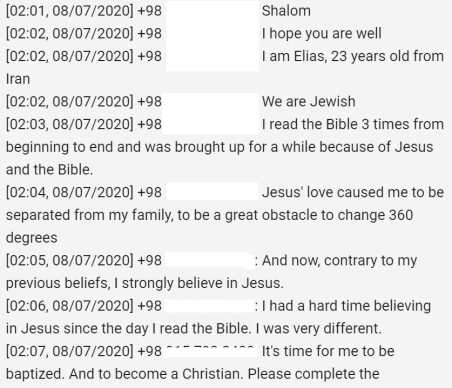 "And we had contact with one of the few Jews remaining in Iran who now wishes to become Christian. The Iranian Jewish community is estimated at around 20,000. Most have emigrated. His name is Elias and we ask for your prayers for him; his messages sound legitimate, and if indeed they are, then we marvel at how the Lord is reaching out to a Jew in Persia, at this very late stage. You can read some of his messages below; we've obviously removed his phone number, but you can enter into the spirit of it"