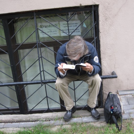 Through all this, Vladimir came to understand the Truth as we do in many ways. He heard about our meetings and came along when we were meeting in the basement at Kalnciema street, the first hall we had in Riga before we moved to the larger one which many of you will be familiar with. We clicked immediately and very soon we baptized Vladimir in the bathtub we installed in the tiny "kitchen" under the stairs at that 'hall'. Always, Vladimir was reading the Bible, often in Hebrew. He'd arrive early when the hall was still closed and would squat down and get some more reading done- realizing even then that his sight was failing. This picture of him doing this has long been on the front cover of Duncan's verse by verse Bible commentaries in tribute to him and his zeal for God's word:
