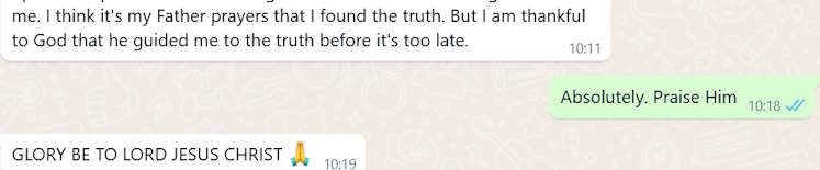 At the beginning of 2023, she constantly entered my dreams. In the dream she didn't have crutches, didn't bend her waist, and had a smile on her face. She was holding a basket of vegetables in her hand, calling my name, asking me to believe in Christ. I couldn't forget this, so I started to seek Christ. This is how we get connected. Now I am getting older and I can feel my health becoming weaker, my temper has also become increasingly irritable, I guess my time is nearing. I beg that I can meet my wife again in the kingdom of God. Whilst I am alive I want to be helpful in preaching to others. God bless"