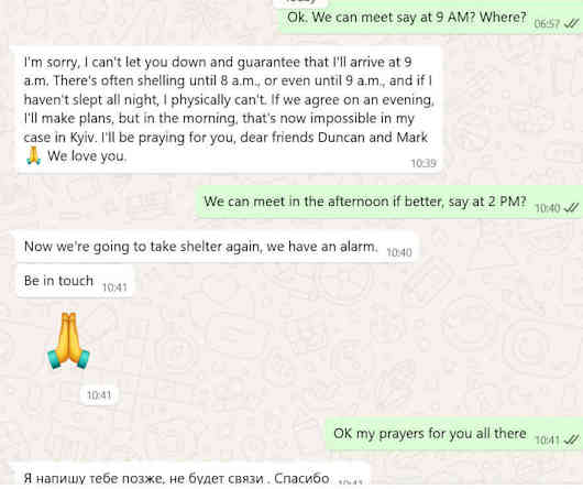 As this message goes out, Mark and Duncan are en route to Ukraine including to some front line areas and we appreciate your prayers. Especially as we plan our visits in Ukraine, what to risk, what not to. We always end up the calculations by saying "Yes" rather than "No", but yes we do calculate, in faith, we are not reckless nor fatalistic. But as you can see from just one of many chats [most aren't in English, this one is as Natalya knows English] there are risks involved to put it mildly and we do appreciate your prayers. She concludes by quickly writing in Russian that communication is now going off and she hopes to write when the shelling finishes.