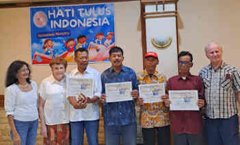 We were very blessed to be able to visit Solo, Central Java, Indonesia for a month. The main reasons for visiting for a longer period was to spend time and encourage Sis Emy, Bro Sigit (her brother), within their Social Ministry Charity known as Hati Tulus Indonesia (meaning is Sincere Heart Indonesia). They have 2 parts for their ministry. 1. A Christian base Children Orphanage Home and 2. Homeless Ministries to help & teach the Bible Truth to the Homeless within their city. The highlight of the trip was the Baptisms of 3 new brothers, Bro Danur Philipus, Bro Yudi Lazarus and Bro Suratman. They are the result of about 5 months of Sis Emy and her team working with the ones who are homeless. Each Tuesday and on Thursday, they have an evening "church under the trees" with attendance of up to about 25 people. Activities include hymns, testimonies, prayer requests, Bible Study, discussion and a simple meal to finish. giving out their certificates,