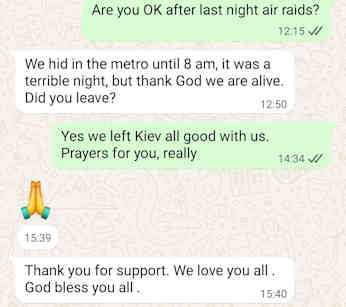 There has been some of the heaviest bombing of the war this week in Kiev. Our dear ones are all physically OK but the mental trauma is huge. Our correspondence is mainly in Russian and Ukrainian but here's a screenshot of a brief dialogue in English with sister Natalya. Please do pray for them all.