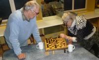 There are times when people respond to the Gospel initially as a result of a `carrot'- maybe the opportunity to study English, to participate in a Bible quiz and so forth. Carelinks don't need to offer many such carrots because we seem to have people all over the world coming direct to us online and in other ways, simply asking to be taught Biblical Christianity. One very small 'carrot' at our Riga Bible Center is the opportunity to play chess before and after our meetings. A while ago, Carelinks` readers responded magnificently to an appeal for chess sets. We have a wonderful collection, from South Africa, Holland, England, America and elsewhere. And they are well used. Sister SARMA was the former chess grandmaster of Latvia- unusual for a Soviet woman. And she is an unusual woman. She was an electrical engineer who rose to a senior management position and still found time to play chess with her workers. She was pensioned out of the workforce and lived quite well on her invalidity pension- until the collapse of the USSR. Now she has a tiny pension, and at 74 years old has various health issues which mean she speaks in a whisper. Lamenting the collapse of morality in society and what she calls `a spirit of anti-intellectualism', she was fascinated to hear that a group of men play serious chess at a center where the Bible is taught and free meals are provided. So she came along- initially for some company and to play chess. Here she is playing with some of our brethren: