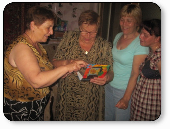 Sister Nana, left, showing other sisters photos of a Bible School