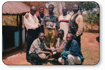 Kneeling right, Bro. Harris, Bible student, Bro. Charles. Standing,