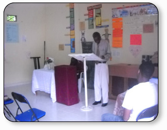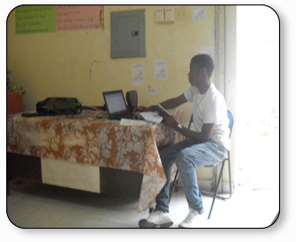 Sunday August 26th, 2012 Memorial meeting held at Llangly District, Port Maria. Young Bro Cadur (newly baptized) selecting hymns on computer to accompany us as we sang.