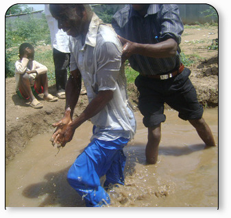 there was no water around as, in this arid expanse where. under the scorching sun, the temperature reaches the highs of 41o C, it's not easy to get enough water for such an exercise. In spite of that harsh reality, God did provide as we had to dig a hole on the ground and fill it up with water fetched in jerry cans from a tap at about 500 meters away.