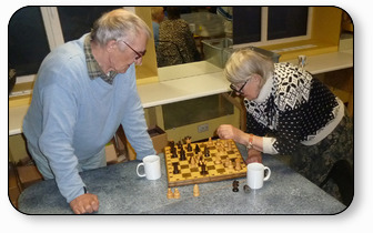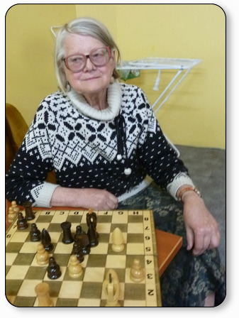 There are times when people respond to the Gospel initially as a result of a `carrot'- maybe the opportunity to study English, to participate in a Bible quiz and so forth. Carelinks don't need to offer many such carrots because we seem to have people all over the world coming direct to us online and in other ways, simply asking to be taught Biblical Christianity. Onevery small 'carrot' at our Riga Bible Center is the opportunity to play chess before and after our meetings. A while ago, Carelinks` readers responded magnificently to an appeal for chess sets. We have a wonderful collection, from South Africa, Holland, England, America and elsewhere. And they are well used. Sister SARMA was the former chess grandmaster of Latvia- unusual for a Soviet woman. And she is an unusual woman. She was an electrical engineer who rose to a senior management position and still found time to play chess with her workers. She was pensioned out of the workforce and lived quite well on her invalidity pension- until the collapse of the USSR. Now she has a tiny pension, and at 74 years old has various health issues which mean she speaks in a whisper. Lamenting the collapse of morality in society and what she calls `a spirit of anti-intellectualism', she was fascinated to hear that a group of men play serious chess at a center where the Bible is taught and free meals are provided. So she came along- initially for some company and to play chess. Here she is playing with some of our brethren: