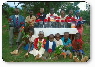 The Turbo Ecclesia, including Bro. Emmanuel Milimo (left) and Elder Sister Beatrice Naliaka (right) with friends and grand-children after the opening of the parcel containing the New European Version Bibles.